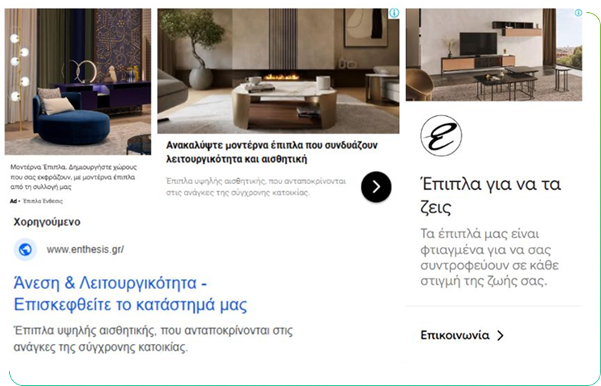 ✦ Keyword Research: Ξεκινήσαμε με αναλυτική έρευνα λέξεων-κλειδιών, εστιάζοντας σε όρους με υψηλή πρόθεση αγοράς και σχετικότητα με τις υπηρεσίες και τα προϊόντα του Ένθεσις (π.χ. "καναπέδες σαλονιού", "έπιπλα κατά παραγγελία", "μοντέρνα τραπεζαρία"). Τα keywords κατηγοριοποιήθηκαν με βάση τον στόχο του χρήστη και την πιθανότητα μετατροπής.